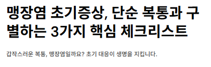 - 약 복용 금지: 진통제나 소화제는 증상을 가려 정확한 진단을 방해하며, 변비약은 맹장 파열을 유도할 수 있어 절대 금물입니다.